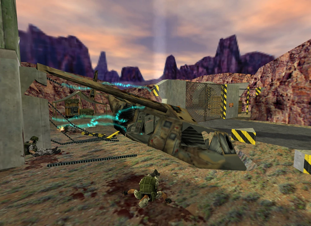 At this point, the surface has become a war zone. HECU forces clash with increasingly large numbers of Xen creatures, and require the assistance of M1A1 Abrams' and M2A3 Bradleys, with AH-64 Apaches patrolling the skies.[14] Even these heavy vehicles are not enough, and the tide of the battle begins to turn in favor of the aliens. Freeman makes his way across the surface as hostilities increase, traversing the Sector G Hydro Electric dam, and slowly moves through the rocky Black Mesa desert while under fire from an overhead Apache. He descends into the drainage systems and steps out onto a huge military-occupied cliff face overlooking an expansive desert canyon and the nearby river. Soldiers and sentry guns guard the cliff side, and after Freeman fights through them and retrieves a HECU RPG on the far side of the cliff, another Apache appears. After a brief confrontation, Freeman destroys the Apache and moves back towards the facility to reach his goal - the Lambda Complex.[14]
