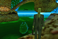 On Xen, Freeman engages the Nihilanth in its lair. As he battles the creature, it teleports him to several sub-caverns filled with Xen creatures. Freeman continuously escapes these caverns, and destroys the Nihilanth's shield, allowing him to destroy its vulnerable brain. As the creature dies, it floats toward the ceiling, and explodes in a giant green blast that overpowers his senses.[42] When he comes to, he is confronted by the G-Man, who had stripped Freeman of all his weapons while he was unconscious under the excuse that "most of them were owned by the government". But stating that he had earned the suit. Both are transported to various locales around Xen, while the G-Man praises Gordon's actions in the border world. He explains that his "employers", agreeing that Gordon has "limitless potential" and have authorized him to offer Freeman a job. The final teleportation takes Gordon to the same tramcar that he rode in on the morning of May 16, but apparently flying through space at immense speed. Gordon accepts this offer by stepping through a portal, and, finding himself floating in nothingness, hears the G-Man's voice one last time: "Wisely done, Mr. Freeman, I will see you up ahead...".[44]