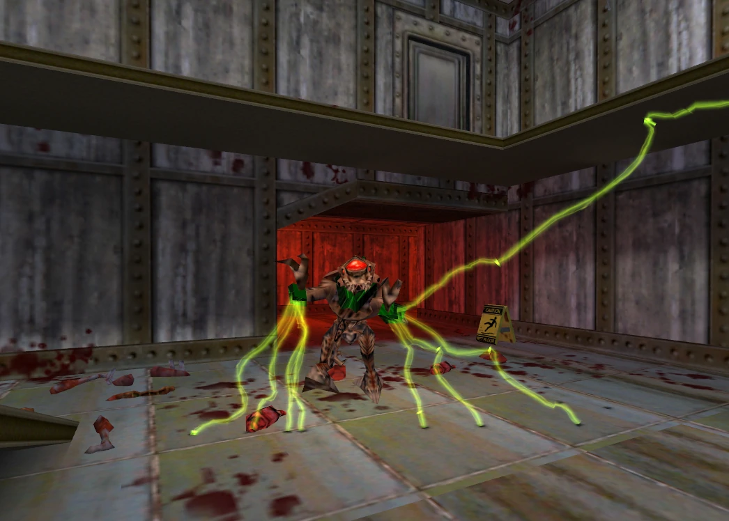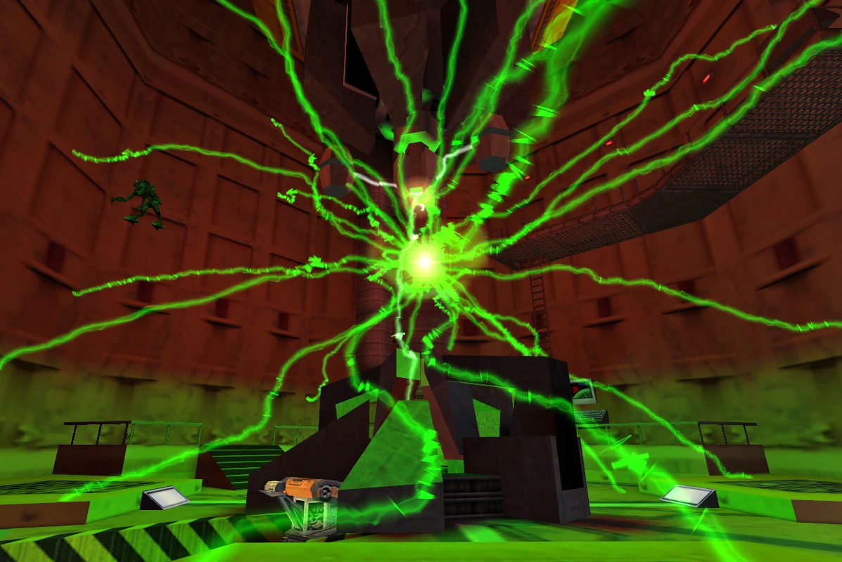 A Vortigaunt attacking Gordon in the run-down areas of Sector E.