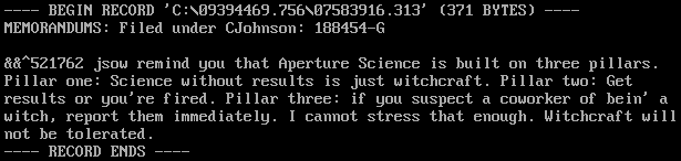 An excerpt of Aperture Science and Johnson's history revealed through the NOTES command on ApertureScience.com.