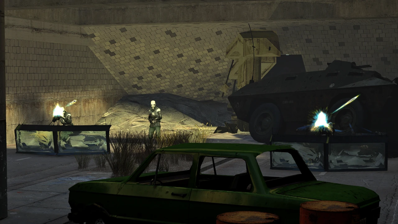 Metrocops firing at Freeman with two Emplacement Guns and a MP7 in a City 17 tunnel.