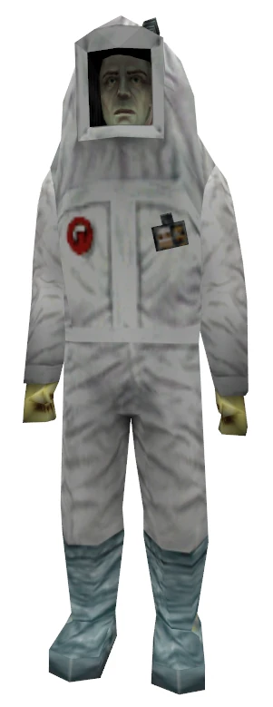 The cleansuit is a personal protective uniform worn by some of the Black Mesa Science Team in Half-Life: Opposing Force during the chapter Welcome to Black Mesa and Crush Depth and appear in limited areas. Unlike most scientists, those wearing a cleansuit do not have first aid skills and are unable to administer a 25-point medicine boost to a player with a health level under 50. In the HD models of the cleansuit scientists, the head is changed.