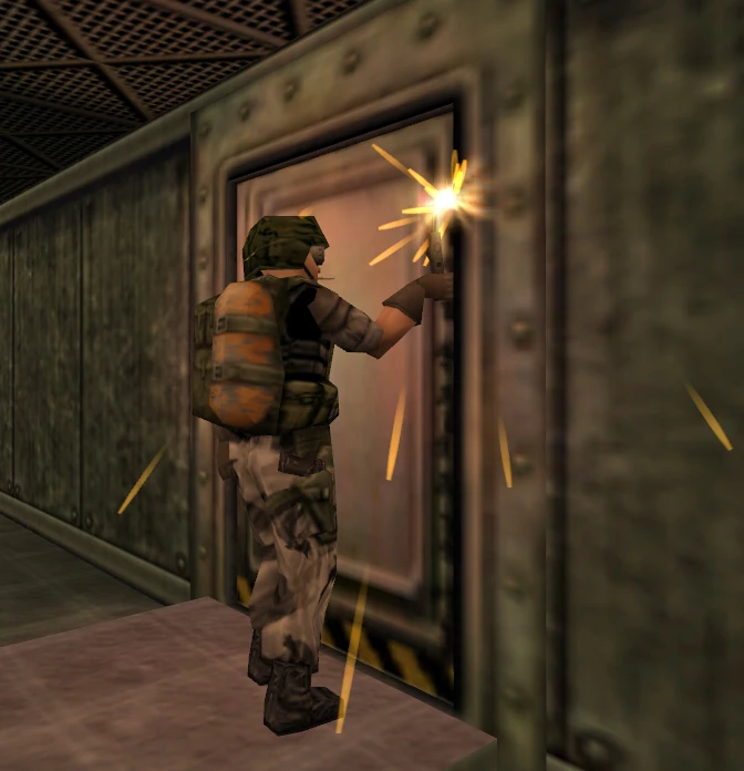 The Engineer only directly appears in Opposing Force, where he is first introduced in the training chapter, Boot Camp, during the "Squad Training" exercise. In the other games, his presence is only suggested when a door is cut, the Marines standing behind being only generic models.