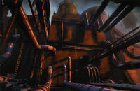 While the playable game leaked in 2003 is quite similar to the retail product and already heavily trimmed, this earlier period of development of the game shows a quite different style. At this point, City 17 was an American East Coast-like city based on Washington, D.C.,[1] with many large skyscrapers, and had a very basic, blocky FPS design.[2] It was more faithful to the concept art seen in Raising the Bar: darker, gothic, sinister, rainy, foggy, gritty, with a lot of brick, metal, and glass, getting along well with the cut concept of the Combine replacing the air with poisonous gas and draining the oceans. It was, therefore, a much more dystopian, Orwellian universe (even though the final product is still quite Orwellian) with touches of cyberpunk/steampunk style, in the vein of the book/film 1984 or other films such as Dark City, Blade Runner, City of Lost Children, and Avalon. It was also more faithful to Viktor Antonov's early concept art and work on the game.
