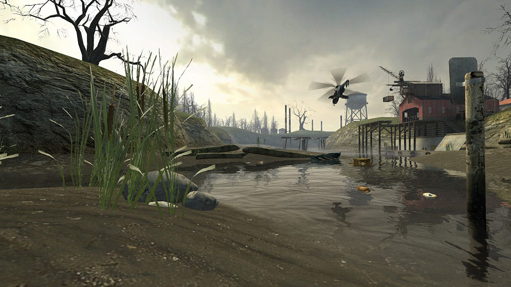 Aboard the Airboat, Gordon fights off numerous Civil Protection units and a Hunter-Chopper in the river, canals and industrial areas around and outside City 17. Along the way, the boat is upgraded with a pulse gun by a Vortigaunt. After shooting down the Hunter-Chopper in a fight, Gordon Freeman finally reaches his destination, an abandoned hydroelectric power plant on the other side of the dam where Black Mesa East is located.