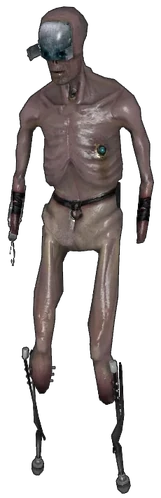 The first known in-game iteration of the Stalker, found in the Half-Life 2 leak, was based directly on the concept art featured in Half-Life 2: Raising the Bar. Captions included in the image provide some in-universe backstory to this cut design. Appearing even more skeleton-like than in the final version, the Stalker can be seen wearing not only a blinder but also a muzzle through which it is able to lap up fluids; both devices are said to have been installed for ease of control and handling. In addition to having portions of its forearms and lower legs severed, the human captive is hobbled during the conditioning process to further prevent escape attempts. Once it is ready to serve, braces that allow for walking are fixed to the stumps. This design was then expanded upon, equipping the Stalker with tools attached to each of its arms, resulting in the final iteration included in the Half-Life 2 leak.